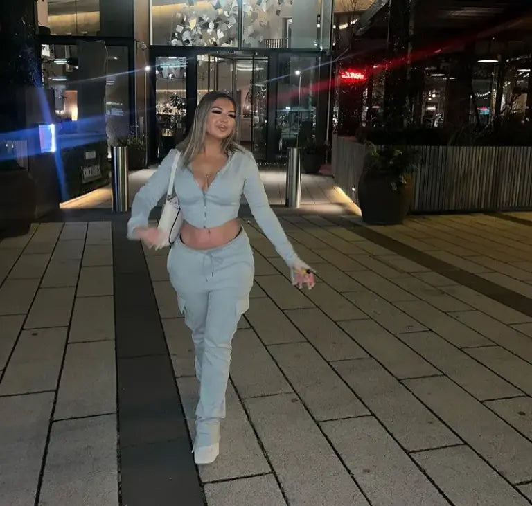This two-piece set features a fitted zip-up hoodie and high-waisted drawstring pants designed for effortless comfort and style. The soft, stretchy fabric hugs your shape while allowing easy movement, making it perfect for lounging, casual outings, or travel days. With its minimal solid-color look and sleek silhouette, this set transitions seamlessly from home to street—pair it with your favorite sneakers or slides for a laid-back yet confident vibe.